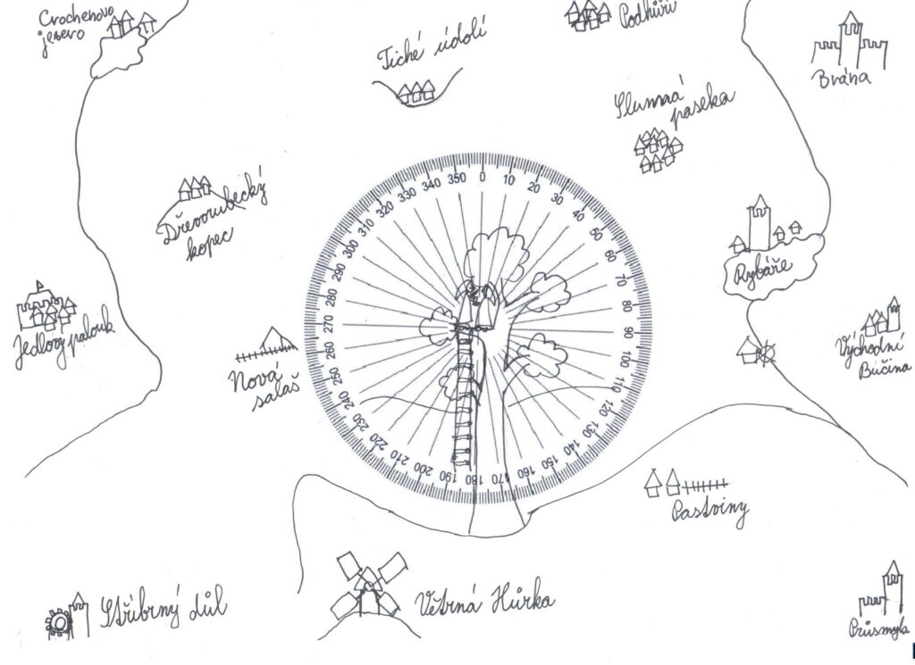 No a teď uplatníme ty azimuty. Jedna z postav na obrázku na stromě je Matěj, který se s buzolou v ruce nejspíš narodil, a každému, kdo si svým směrem není úplně jistý, ochotně radí. Pro lepší přehlednost je obrázek zorientován k severu.