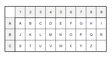 Opět substituce. Písmena určujeme podle souřadnic v tabulce. Přestože by se nám do ní vešlo i Ch, nechávali jsme si políčko C9 na nějaký předem domluvený význam.