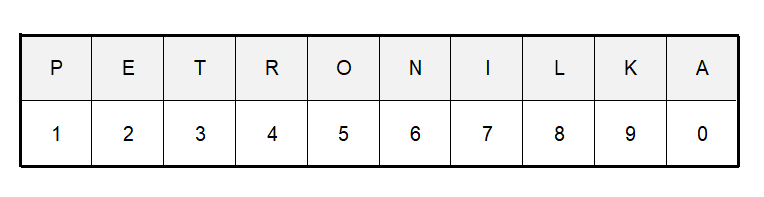 Petronilka je poměrně jednoduchá šifra. Také částečně substituce. Písmena obsažená ve slově PETRONILKA nahrazujeme číslem odpovídajícím jejich pořadí v tomto slově. Ostatní písmena píšeme normálně.