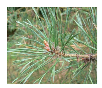Jehličí vyrůstá ve svazečcích po 2-5 kolem dokola celé větvičky (vypadá jako štětka na mytí lahví). Jen u mladých stromků (asi do 3 let) roste jehličí na větvičkách jednotlivě.