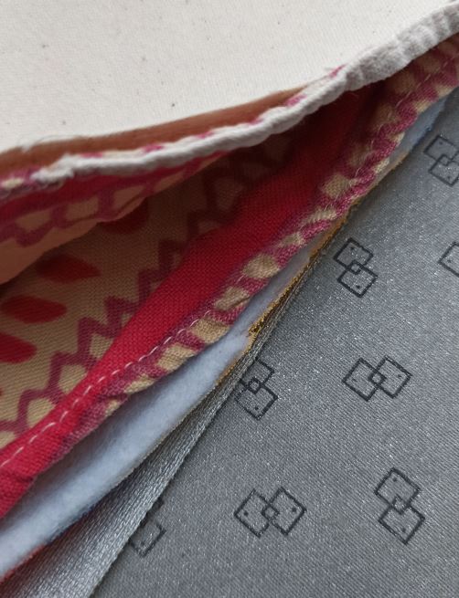 Nyní obroubíme šev i okraj chňapky. Dobře se při tom pracuje se “šikmým proužkem”. Buď se dá koupit nebo si jej uděláme tak, že ustřihneme cca 4 cm široký pruh, dlouhý tak, aby vyšel kolem dokola celé chňapky, ideálně šikmo přes osnovu látky. Okraje proužku založíme, proužek přeložíme napůl a zažehlíme. Bude pak při našpendlování a šití lépe držet zaobroubený.