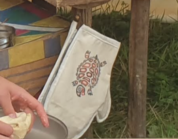 Do týpka k otevřenému ohni se hodí celkem tlustá chňapka. Osvědčilo se nám použít starý potah na žehlící prkno. Z něj vystřihneme část, která bude na straně dlaně. Pozor při stříhání levé a pravé bude potřeba střih otočit 😉