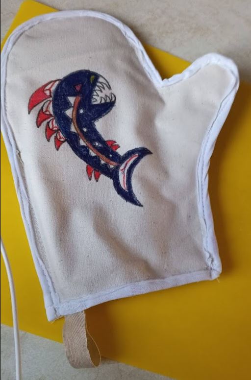 Obrázky na hřbetní straně chňapek jsou malovány fixami na textil.