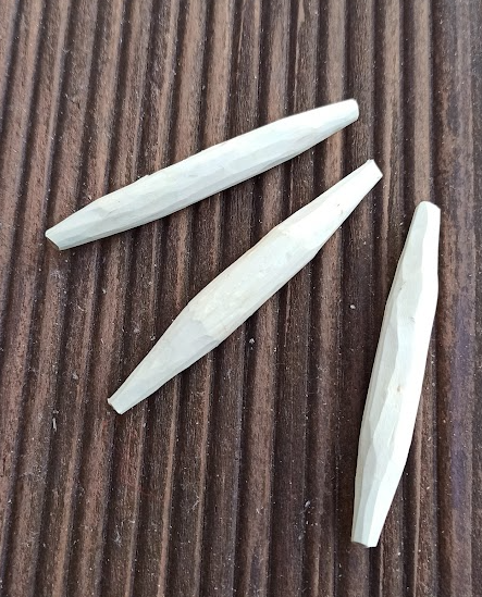 Tady máme další možnost využití odřezků z výroby lenošky nebo postele. Proutky nastříháme na potřebnou délku, seřízneme na obou koncích do špičky a pomocí například pletací jehlice vytlačíme měkčí střed proutku, takže nám vznikne dírka po celé délce kostice.