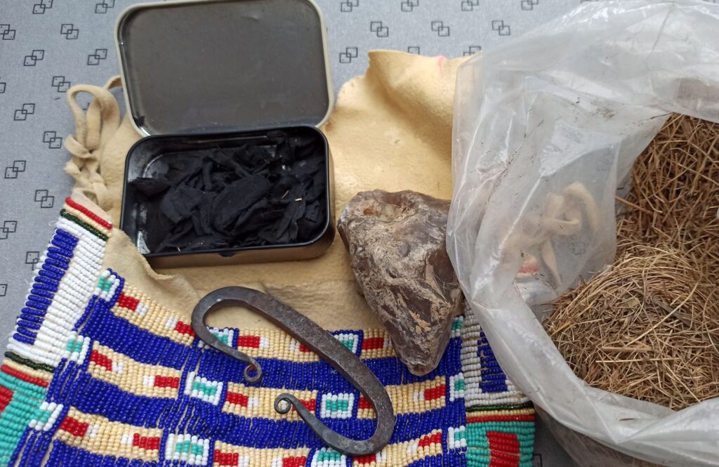 Pro rozdělávání ohně křesáním potřebujeme práchno (bavlněná látka přepálená za nepřístupu vzduchu – tedy zčernalá, dobře chytající jiskru, ale držící pohromadě), ocílku, pazourek a seno.