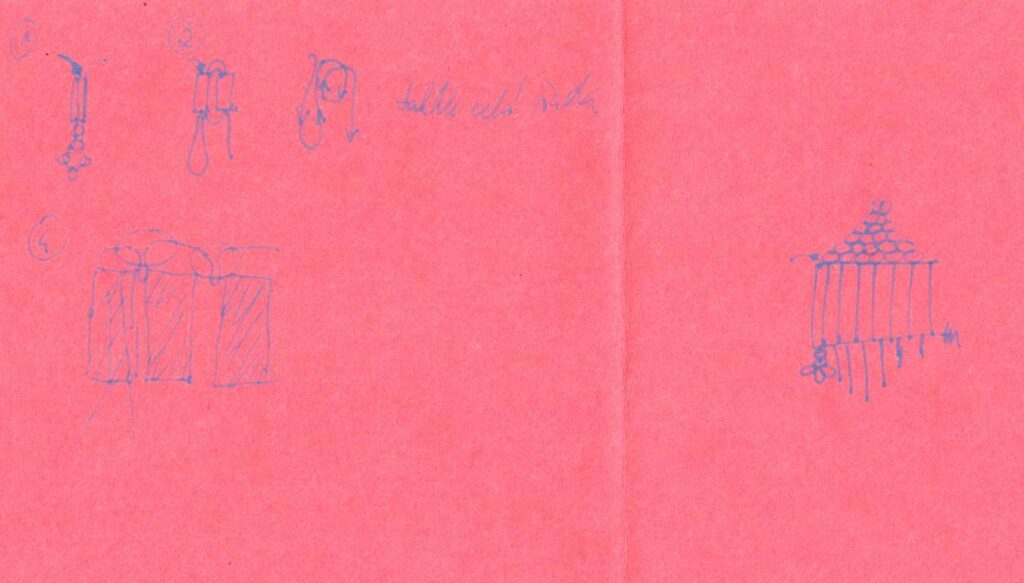 Kdysi dávno mi Věrka nakreslila návod na korálkové náušnice. Na scanu je znát, že už poněkud vybledl (byť podklad je stále pěkně červený), ale čitelný a použitelný je stále.