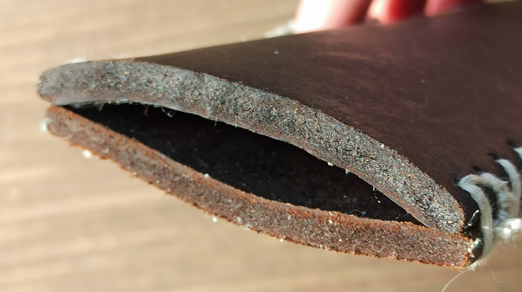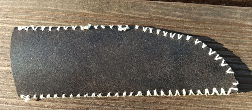 Přečnívající kůži zahrneme přes horní okraj. Vzhledem k tloušťce vnitřní kůže se nedal moc dobře přišít. V místě, kam dosahoval, jsem si propíchala dírky a prošila je zadním stehem. K niti, která byla z této strany, jsem přichytila okraj jelenice, aby se při vyndavání nože nevyhrnovala, ale z fotky sami vidíte, že to nedrželo 🙂 Možná by mohlo posloužit nějaké lepidlo.