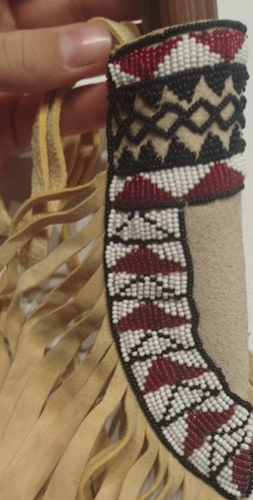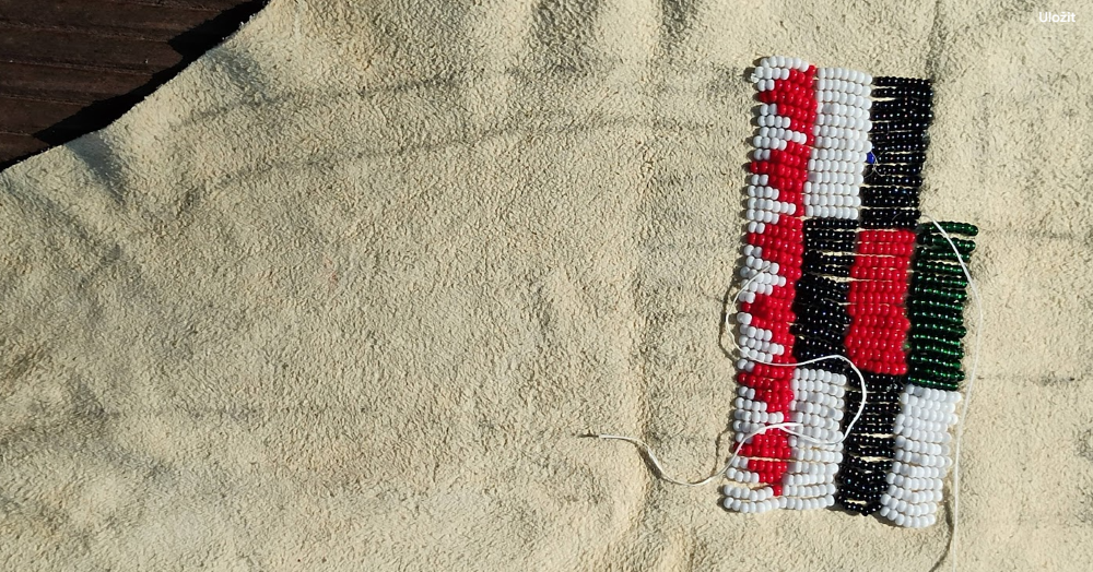 Chceme-li třásně jako na Vojtově pouzdře a nemáme-li dost velký kus kůže, aby vedle výšivky zbylo dost na jejich nastříhání, můžeme do švu při sešívání předního a zadního dílu vložit jiný vhodný kus (nebo kusy).