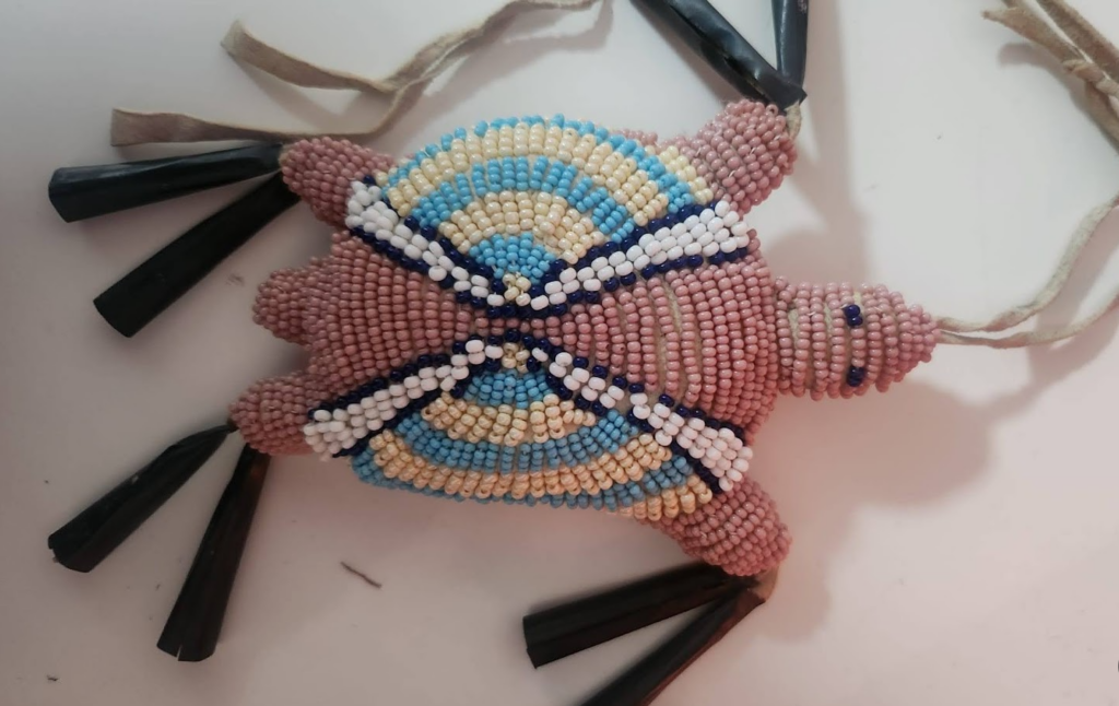 Střih může želvičku připomínat více i méně. Viděla jsem “želvičky” ve tvaru kosodélníku, dokonce i ještěrky. Záleží, jak to cítí umělec. Poté, co ji máme vykorálkovanou, sešijeme hřbetní a břišní část k sobě. Chceme-li, aby z nožiček a hlavičky visely třásně nebo rolničky, toto je pravá chvíle je tam přišít. Také je dobré nožičky i hlavičku průběžně vycpávat, později se k nim hůře dostává (i když, dobře mířená pletací jehlice dokáže divy). Osvědčilo se mi nechat otvor na vycpání na boku. Když jsem končila u hlavičky, nepovedlo se mi ji dostatečně vycpat.