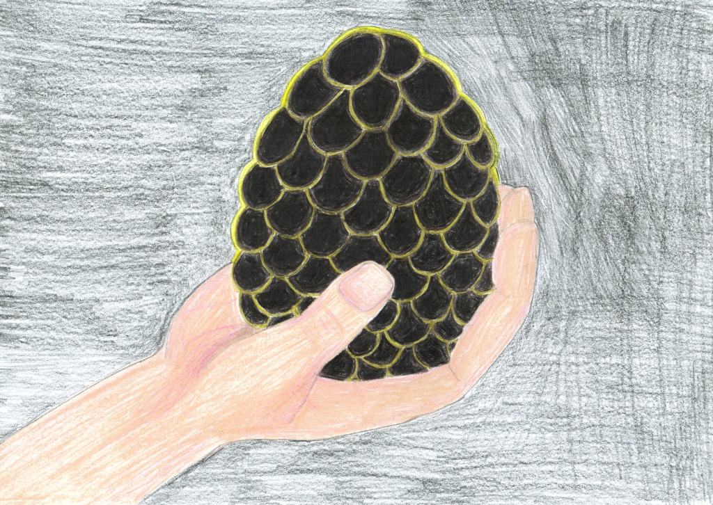 „Něco mám!“ zvolal nadšeně Ymladd a zvedl nad sebe vajíčko. Mělo šupiny a bylo asi tak dvakrát větší než normální slepičí vejce.